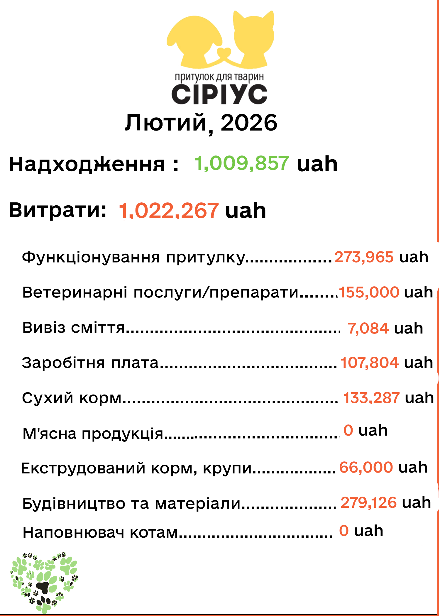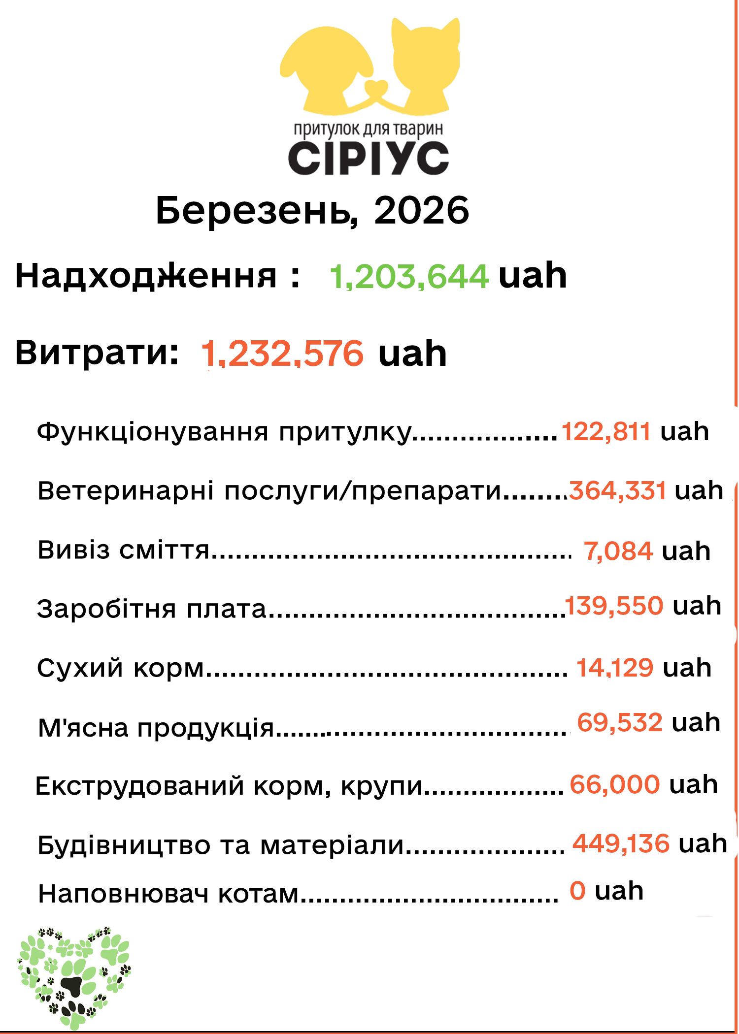 Ми хочемо бути прозорими та чесними з нашими патронами. Кожного місяця публікуємо фінансові звіти та інформацію про прилаштування/надходження тварин.